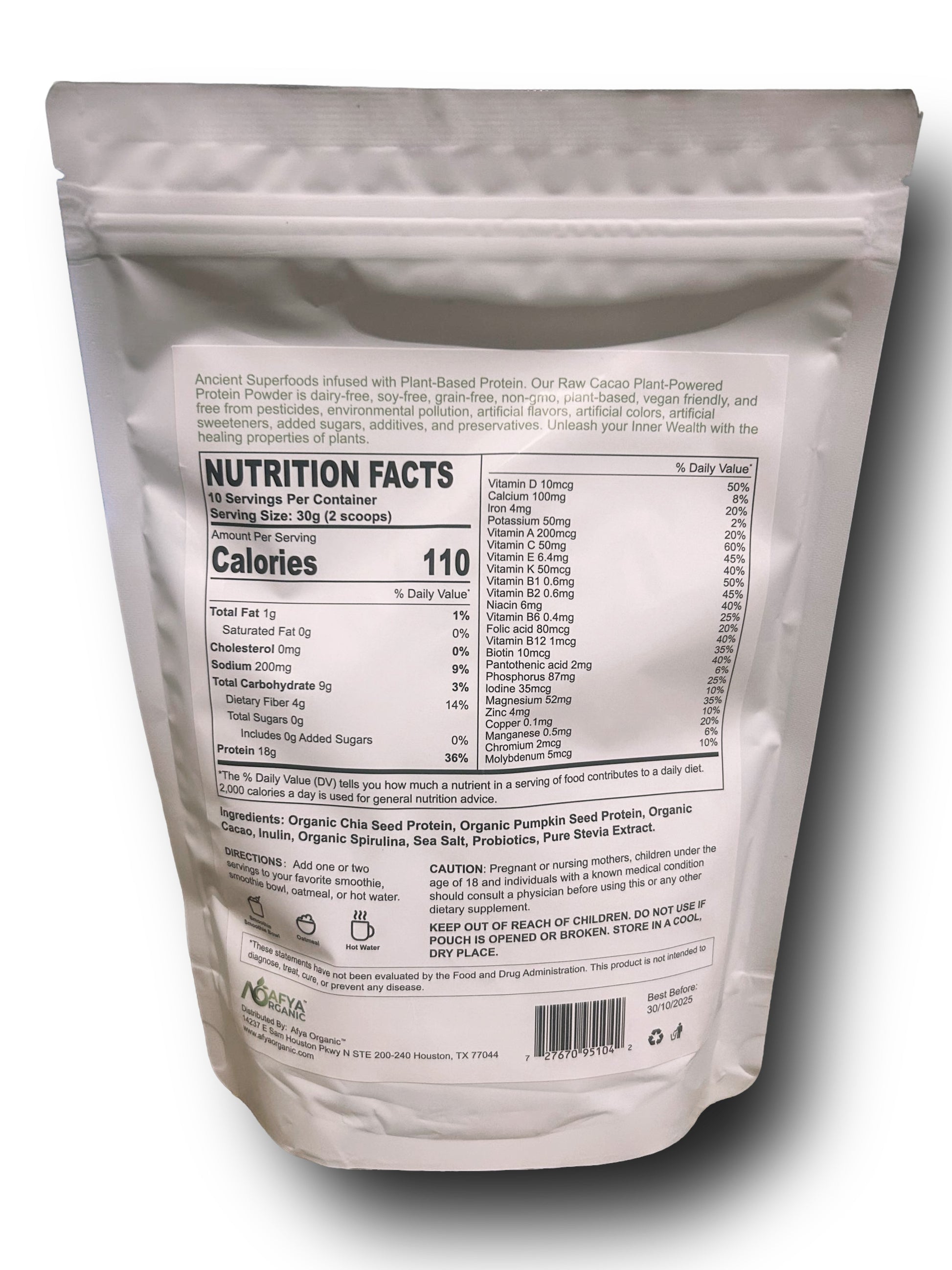 Our Raw Cacao Plant-Powered Protein Powder contains 100% plant-based superfoods infused with plant-based sources of protein. With less than 9 ingredients that are organic and you can pronounce, our Raw Cacao Plant-Based Protein Powder is non-gmo, dairy-free, gluten-free, soy-free, vegan, plant-based, and free from added sugars, additives, preservatives, pesticides, environmental pollution, and artificial flavors, colors, and sweeteners.